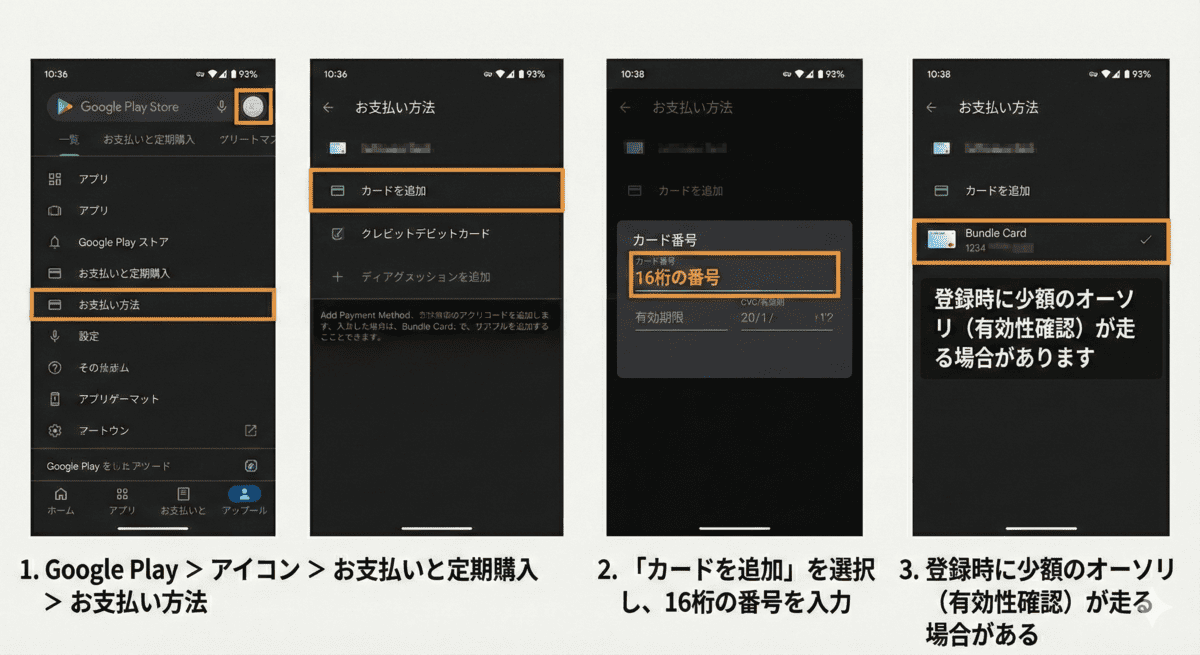 - Androidユーザー:Google Playにバンドルカードを紐付ける手順