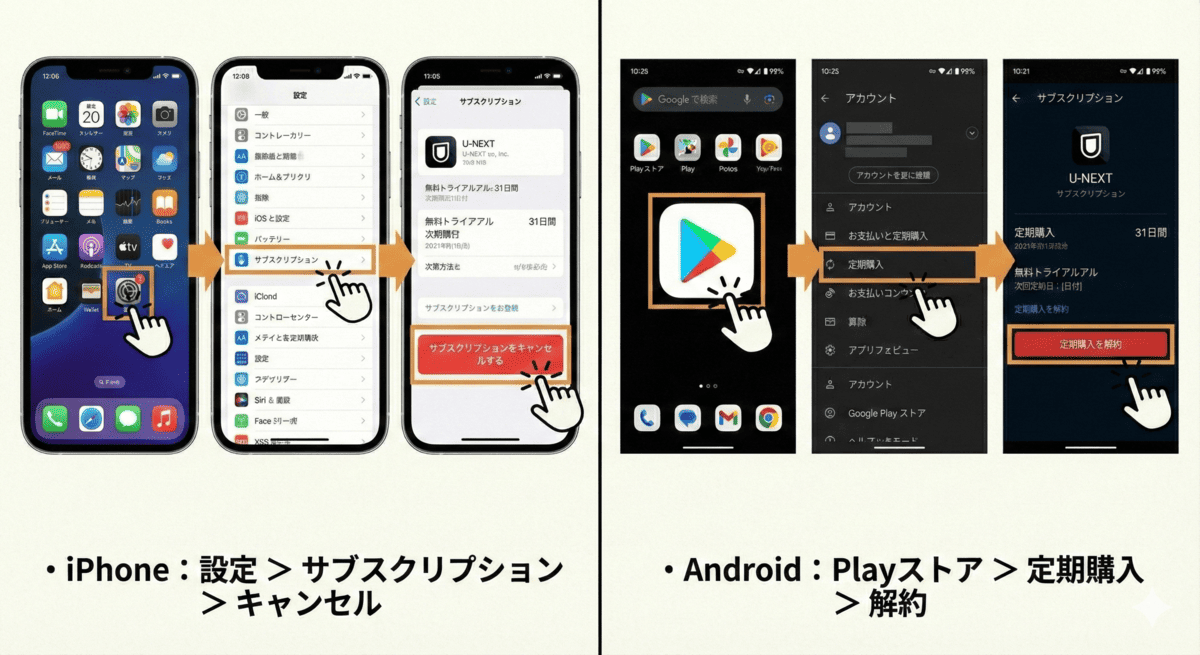 ただし、アプリ決済(Apple ID / Google Play)で登録した場合は、U-NEXTアプリ内ではなくOSの設定画面から解約する必要があります。